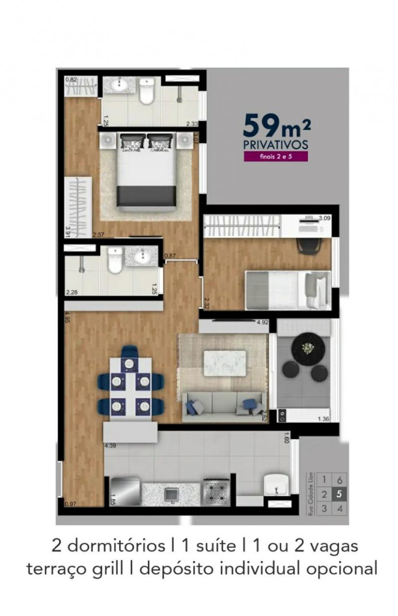 O Residencial Sense Lion são apartamentos de 58 e 59 m² com 2 dormitórios, sendo 1 suíte, varanda e 1 vaga livre.