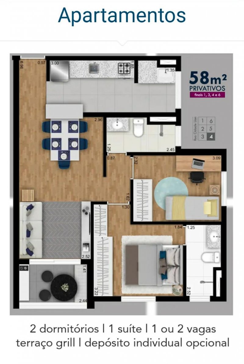 - Área Privativa: 58 m²