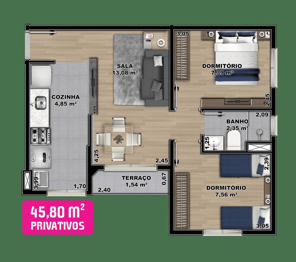 - Área Privativa: 45 m²