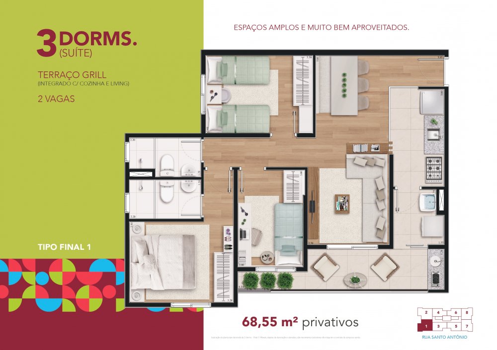 3 Dormitórios (1 Suíte) - Terraço grill - 68,55m² privativos - 2 vagas