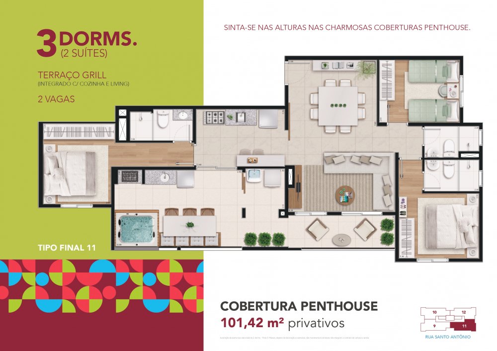 4 Dormitórios (2 Suítes) - Terraço grill com churrasqueira + SPA + Solário 114,95m² privativos - 3 vagas + depósito