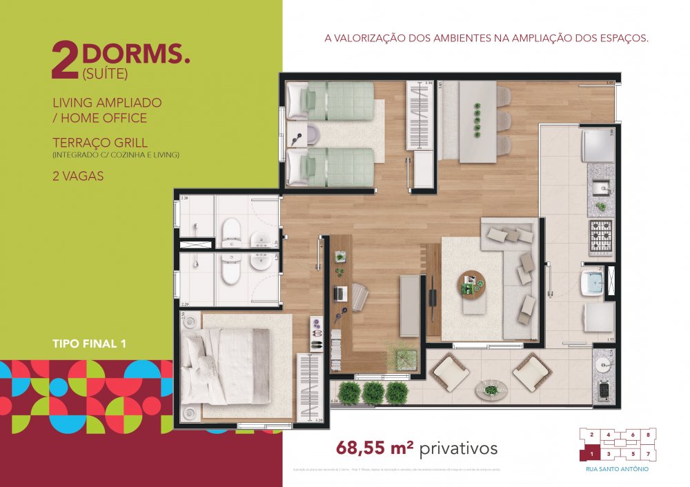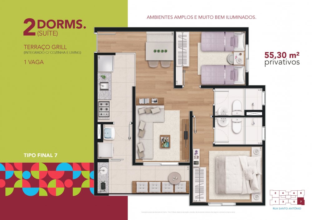 2 Dormitórios (1 Suíte) - Terraço grill - 55,30m² privativos - 1 vaga