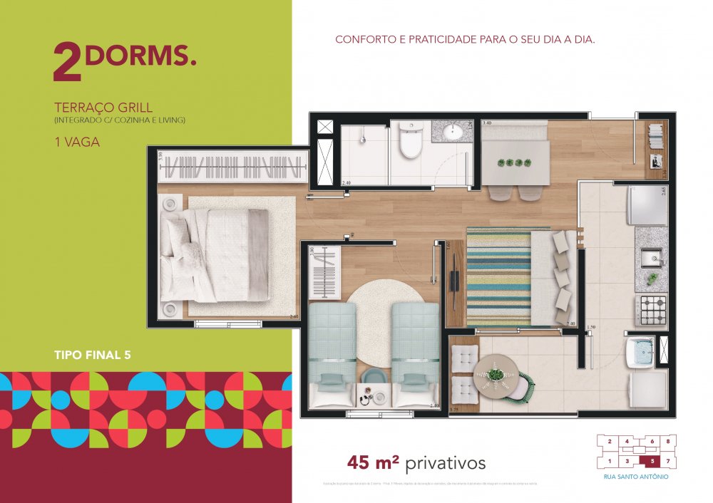 2 Dormitórios - Terraço grill - 45m² privativos - 1 vaga