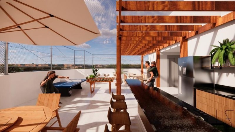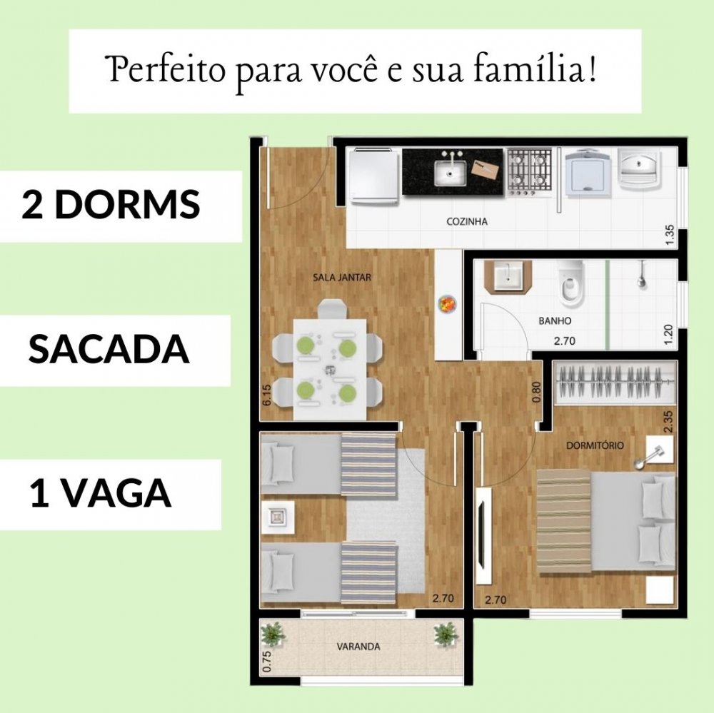 Apartamentos de 40m² com 2 dormitórios e 1 vaga de carro.