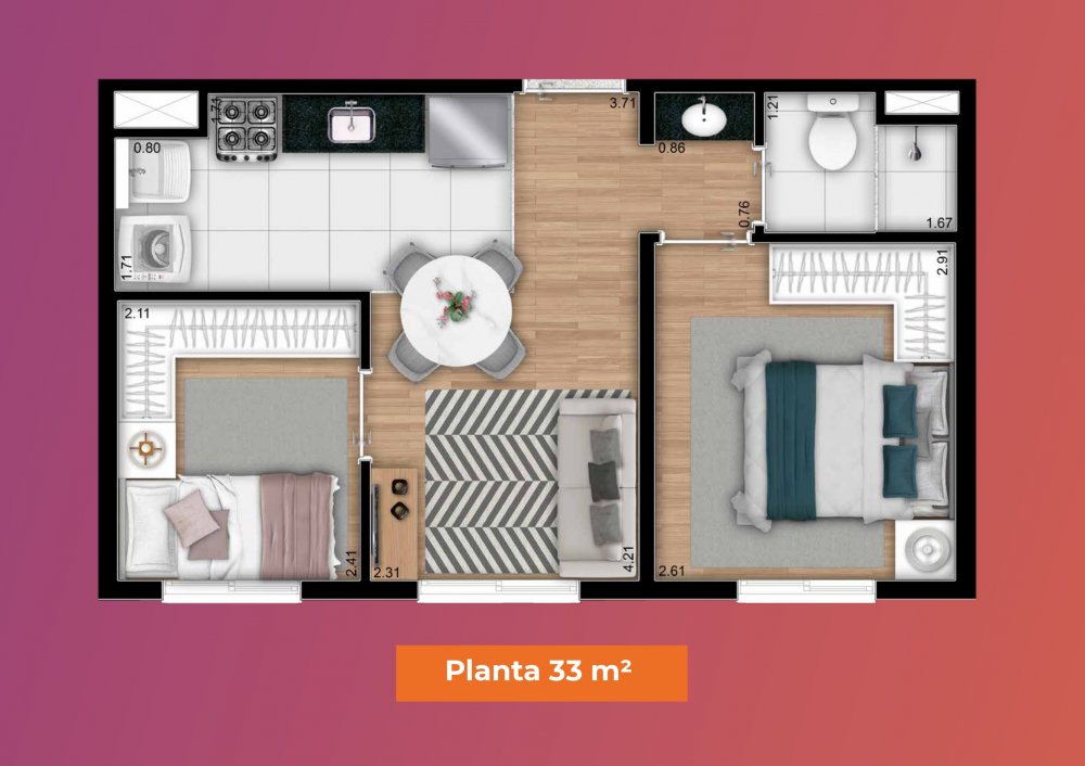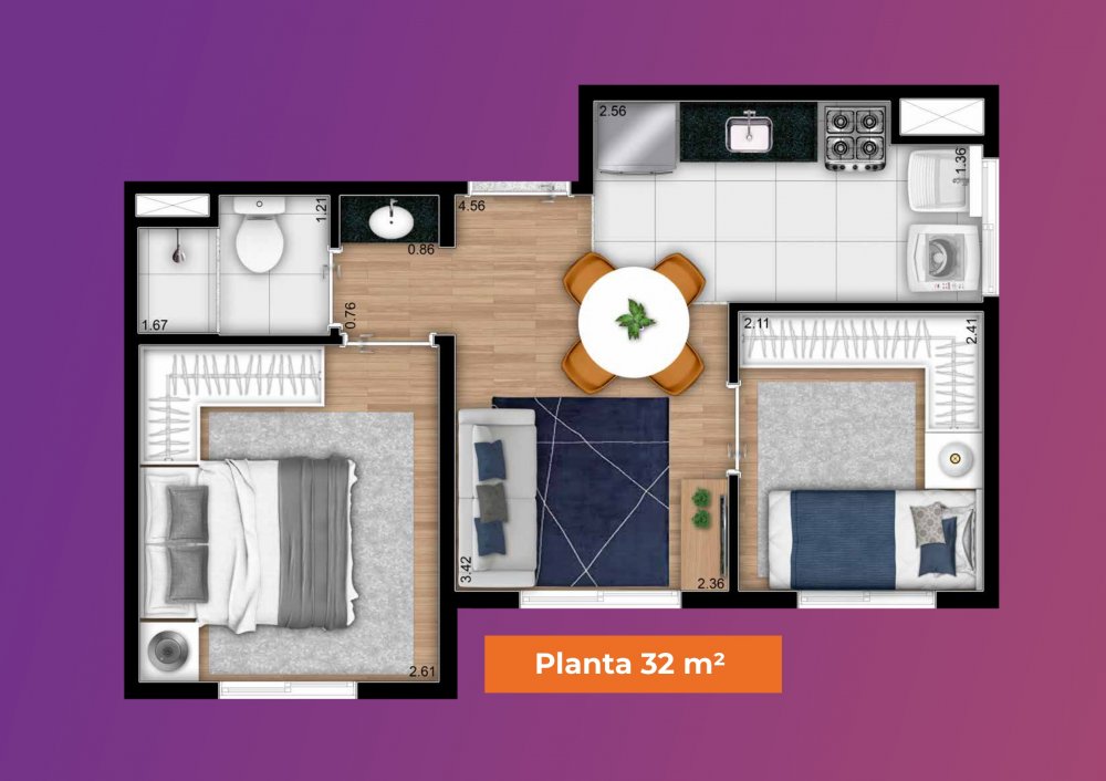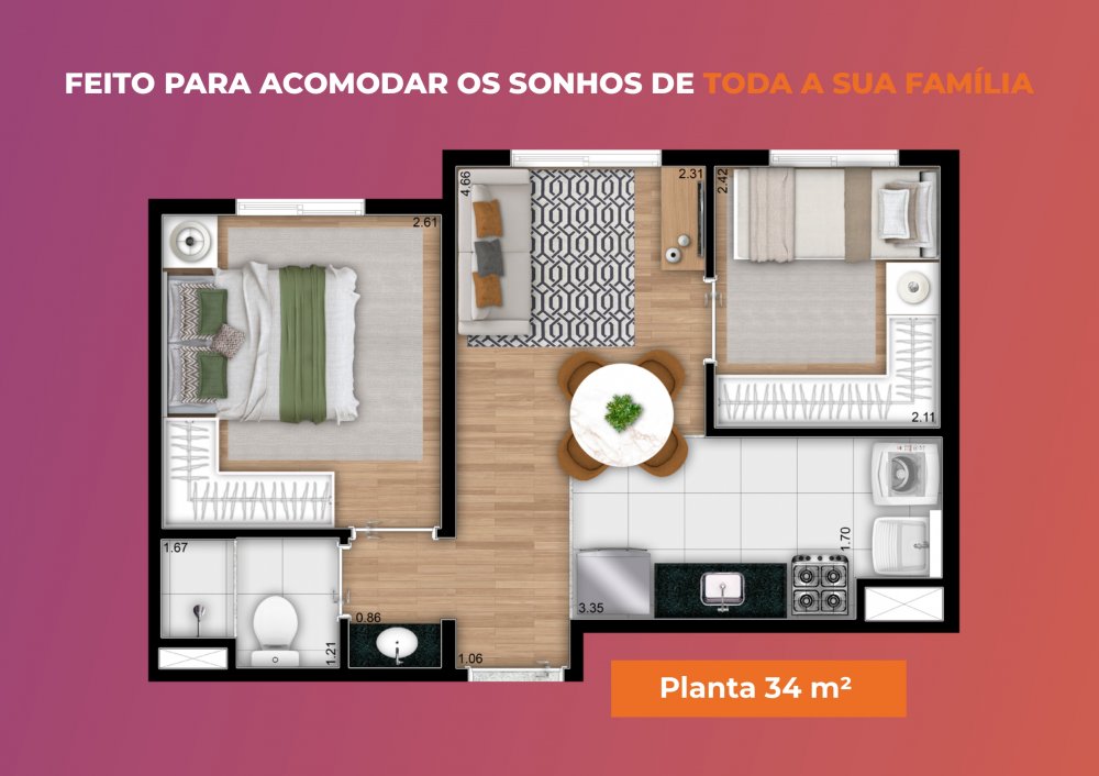 São apartamentos de 32, 33 e 34m² com 2 dormitórios