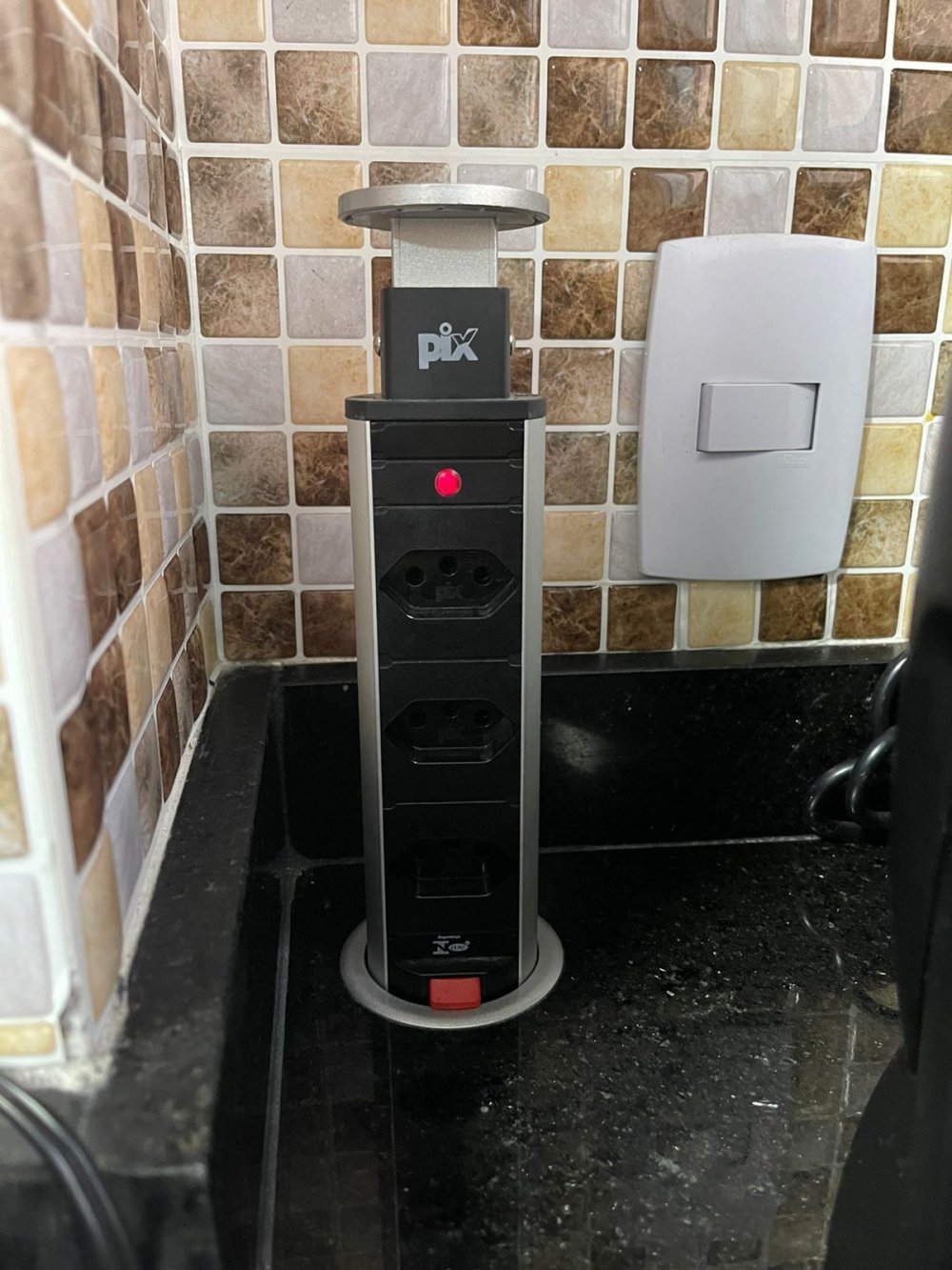 Lixo de pia e suporte de detergente embutidos na pedra mármore, tomada embutida na pedra também.