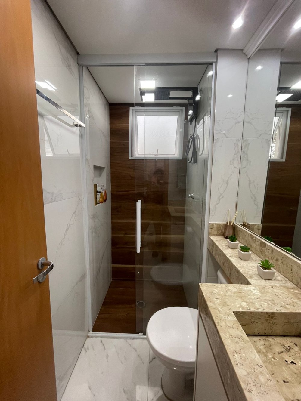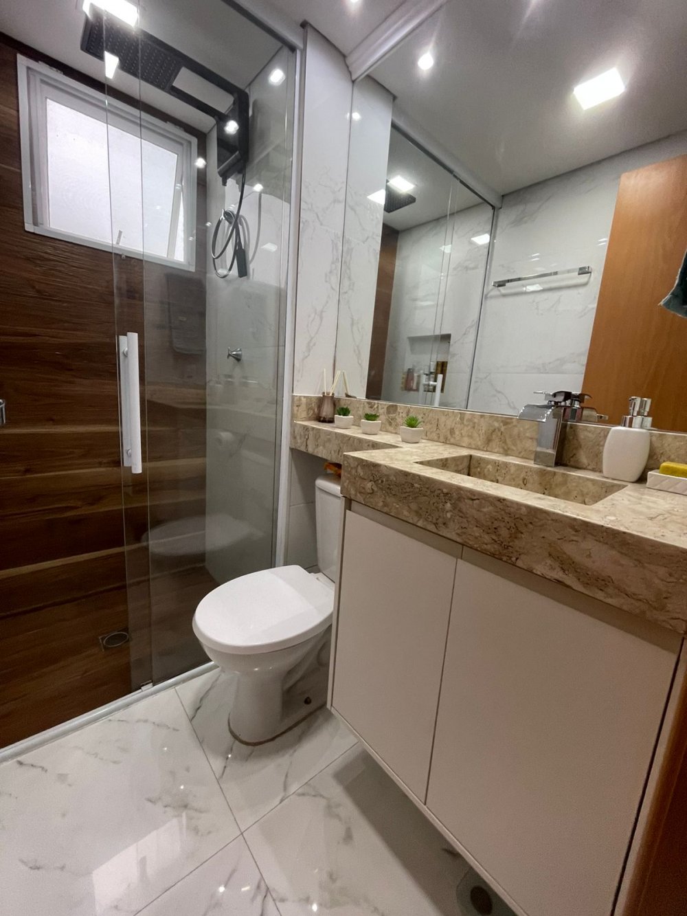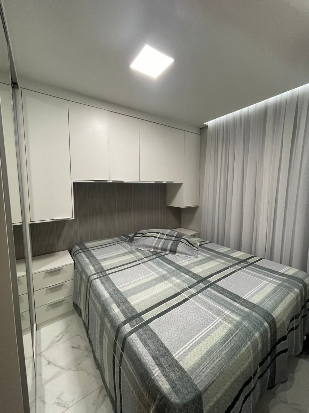 Todo em porcelanato, gesso no teto com acabamento, espelhos, todos os ambientes são planejados!