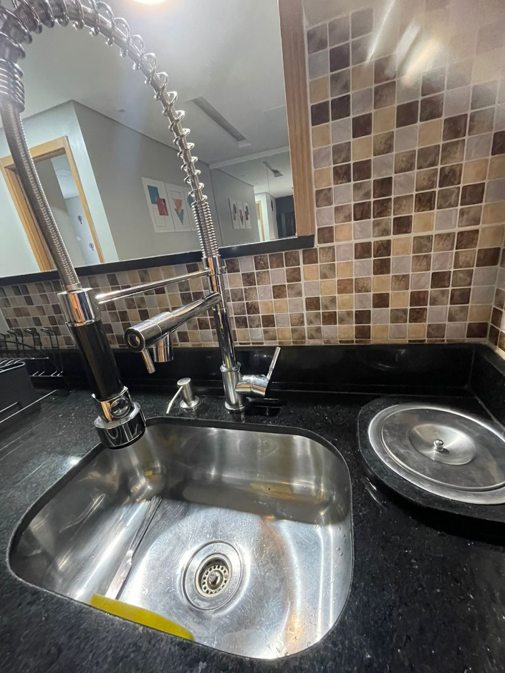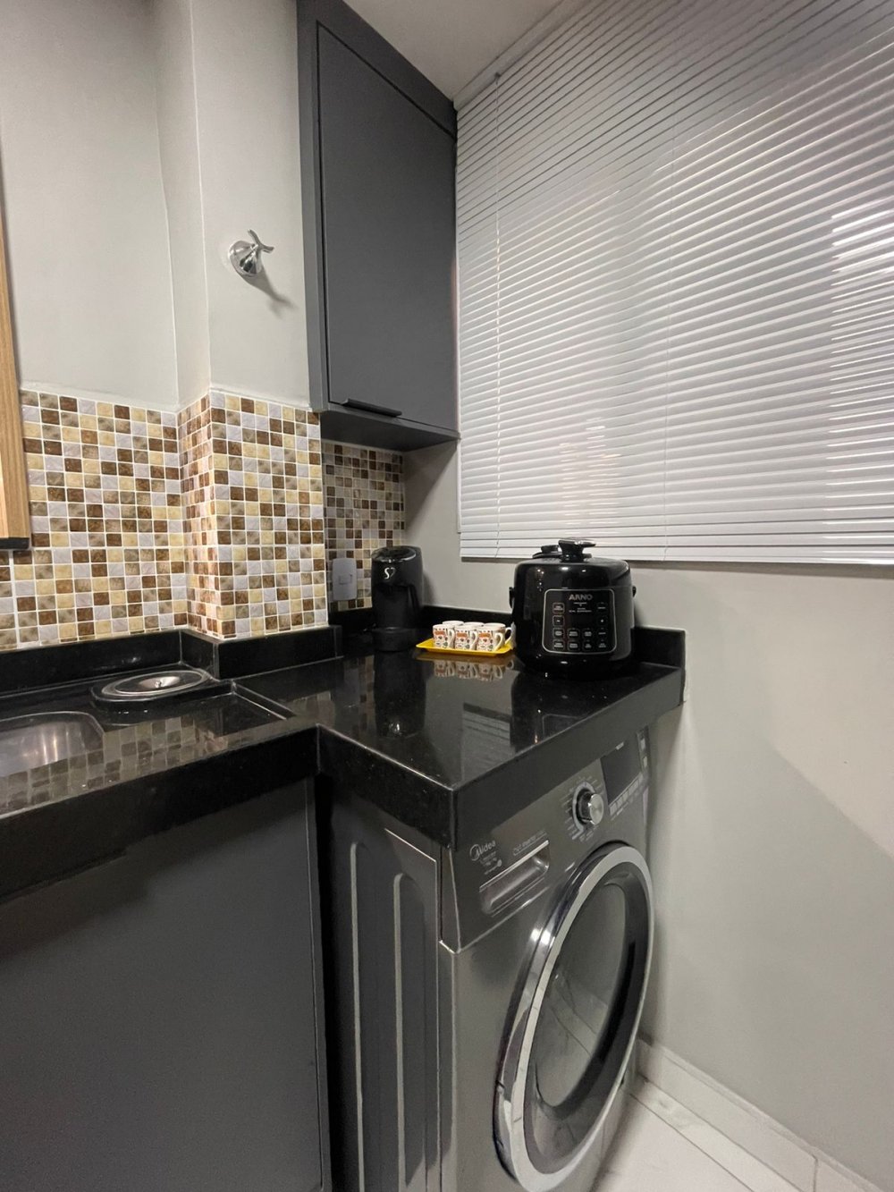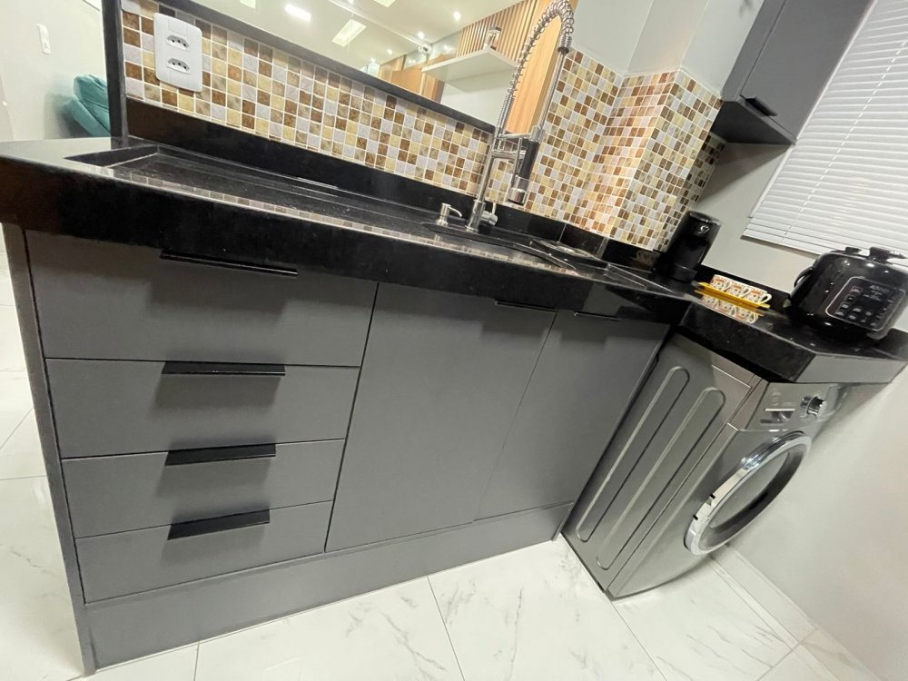 Cozinha toda em mármore preto, o tanque fica escondido, tem uma pedra em cima p/ estender o balcão e esconder o tanque. (Só conectar a torneira quando for usar)