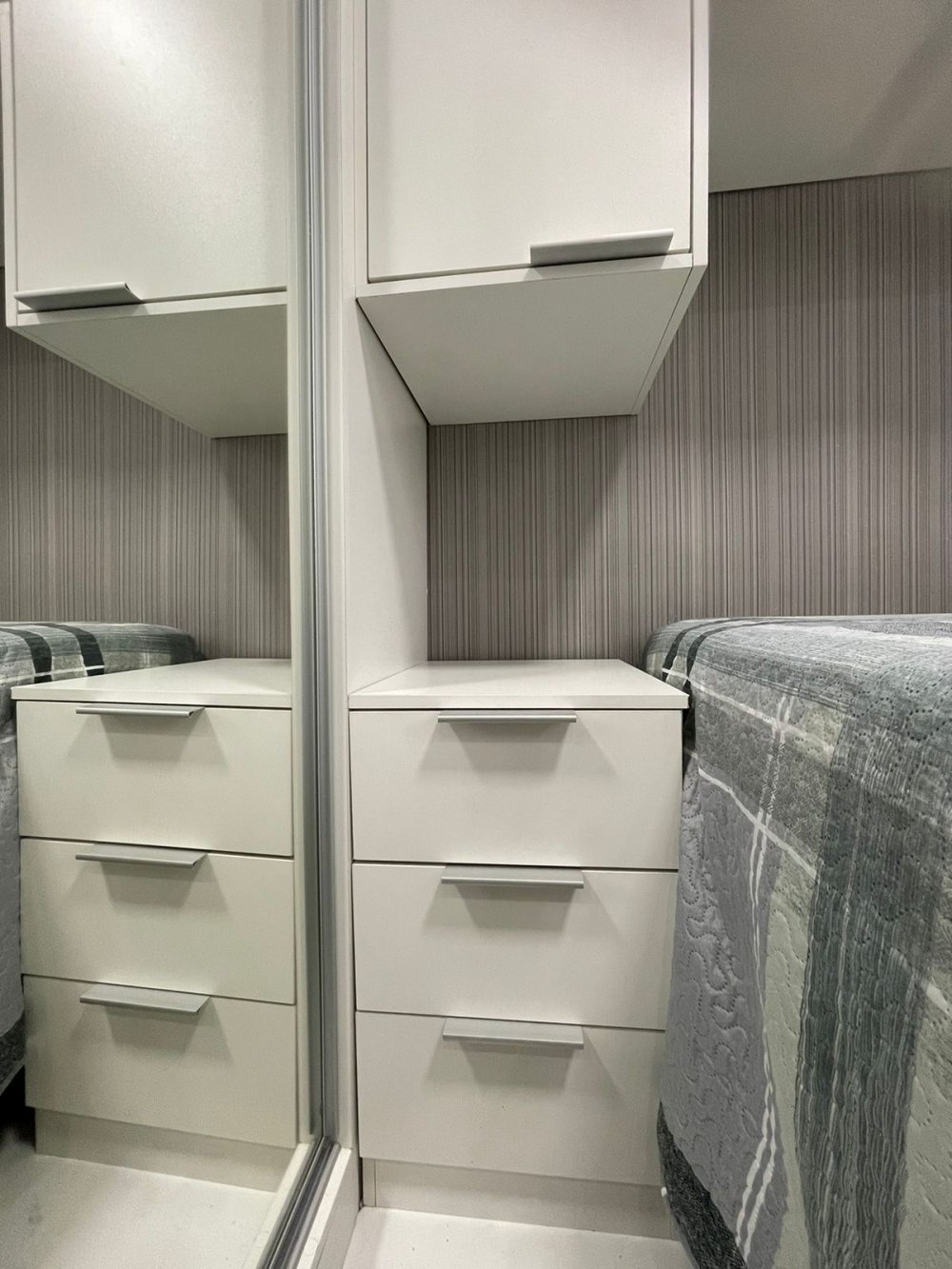 Armário planejado com amortecedores nas portas e gavetas, porta de vidro, fechamento até o chão e gavetão p/ guardar vassoura, rodo etc..