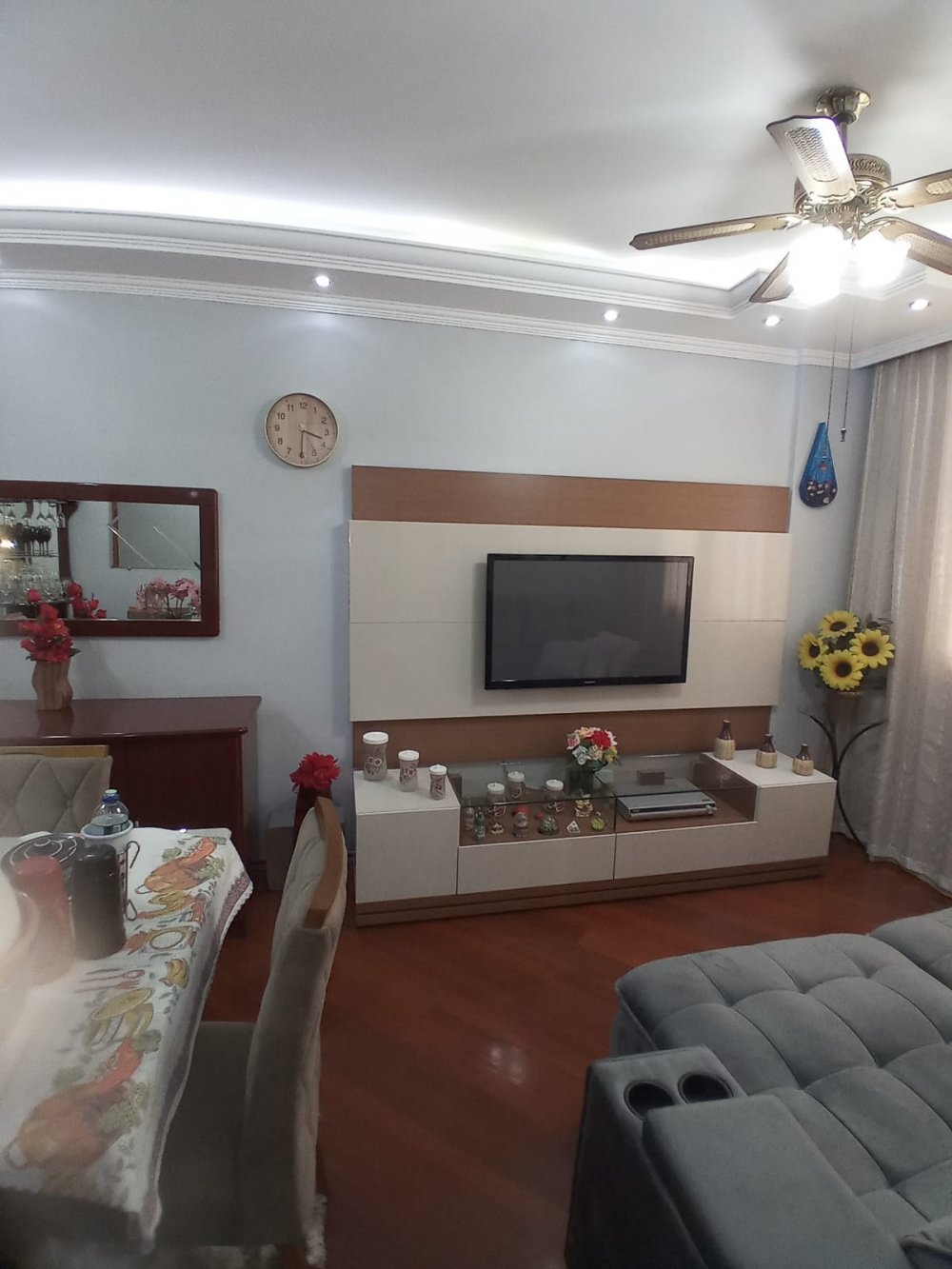 Todo reformado com piso de madeira, sanca de gesso em toda sala e sala de jantar, ventilador de teto. A cozinha com móveis planejados novos.