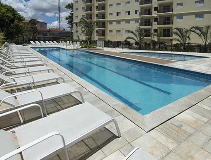 Playground, portaria 24 horas, portão automático, dois salões de festas, quadra poliesportiva, piscina.