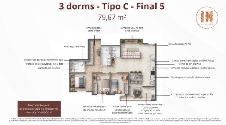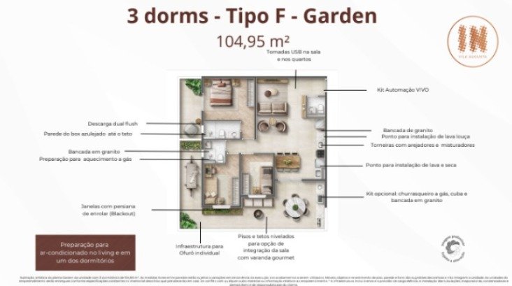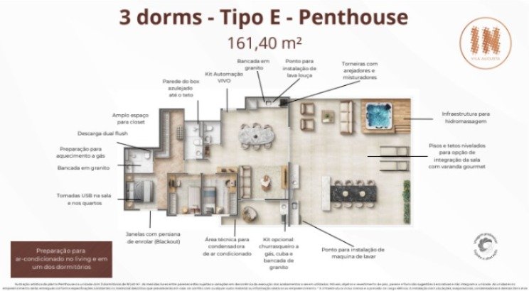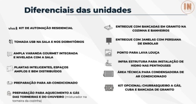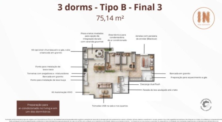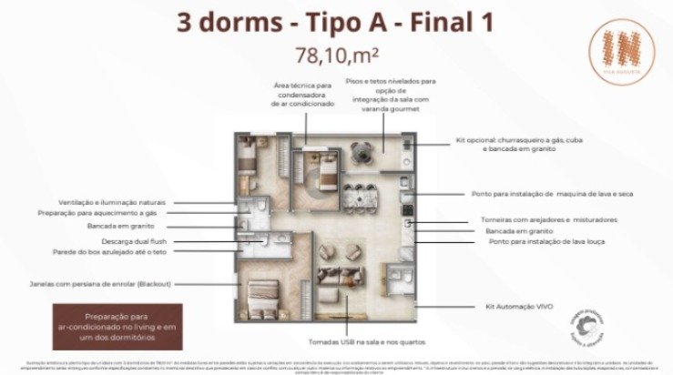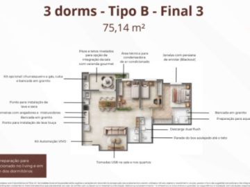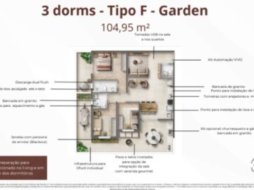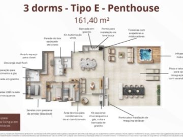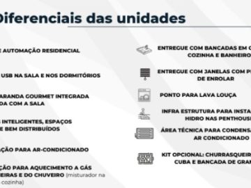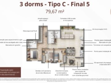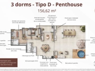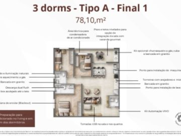 60 unidades com 3 dorms de 78,10 m² com suíte, terraço e vaga - 45 unidades com 3 dorms de 75,14 m² com suíte, terraço e vaga - 15 unidades com 3 dorms de 79,67 m² com suíte, terraço e vaga - 3 unidades Penthouse com 3 dorms de 156,62 m² com suíte, terraço e vaga - 1 unidade Penthouse com 3 dorms de 161,14 m² com suíte, terraço e vaga - 3 unidades Garden com 3 dorms de 105,95 m² com suíte, terraço e vaga