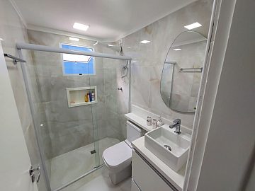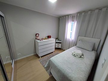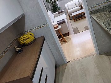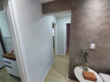 Apartamento 59m2 todo reformado com piso vinílico, móveis brancos na cozinha e nos dormitórios, sala com sanca e spots de iluminação.